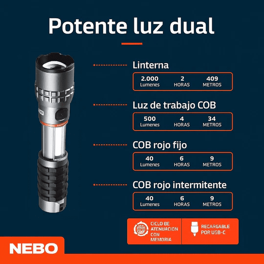 - Doble C•O•B (2000 lúmenes) – 1.3 horas / 70 metros