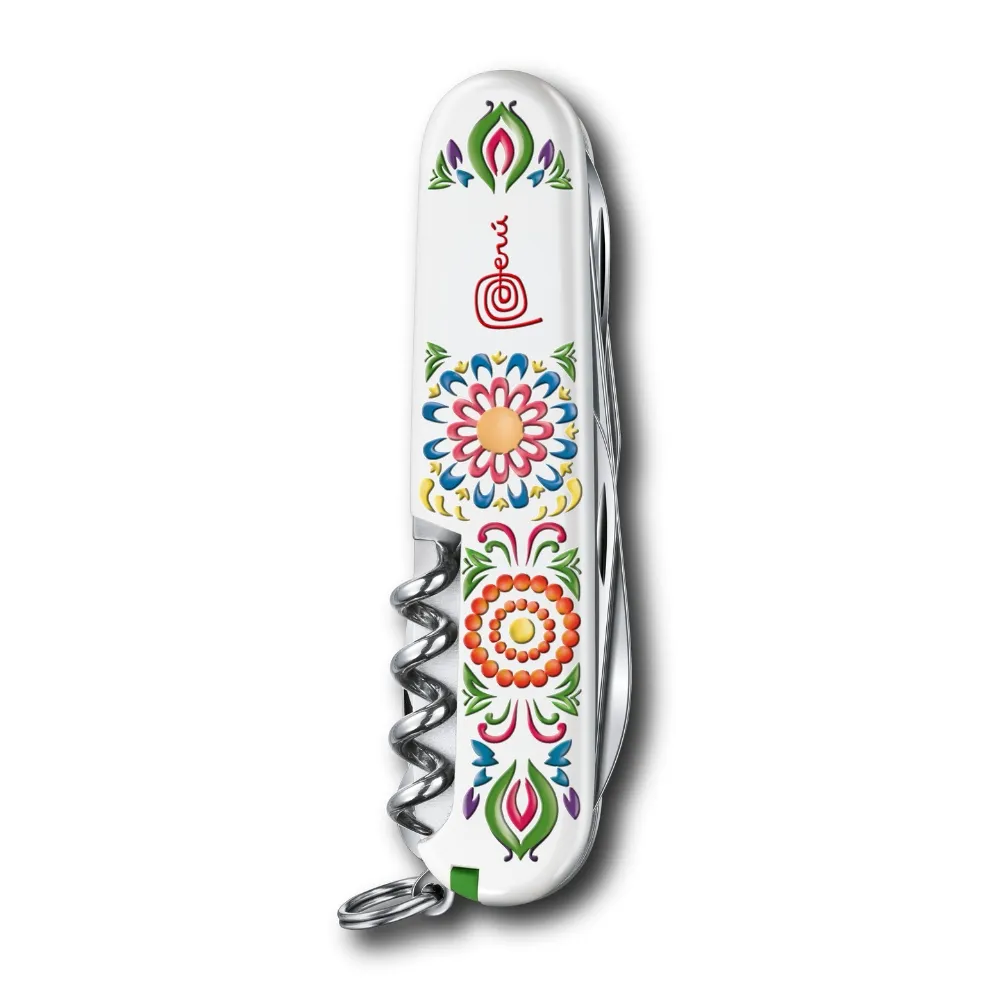 Hoja grande / Hoja pequeña / Sacacorchos / Abrelatas / Destornillador 3 mm / Destapador / Destornillador 6 mm / Pela cables / Punzón, escariador y aguja de coser / Tijeras / Gancho multiuso / Anilla / Pinzas / Palillo de dientes