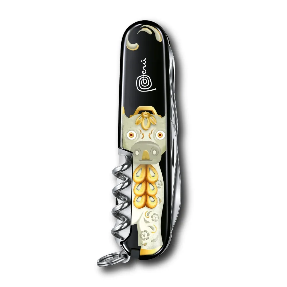Hoja grande / Hoja pequeña / Sacacorchos / Abrelatas / Destornillador 3 mm / Destapador / Destornillador 6 mm / Pela cables / Punzón, escariador y aguja de coser / Tijeras / Gancho multiuso / Anilla / Pinzas / Palillo de dientes