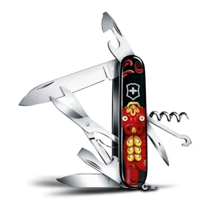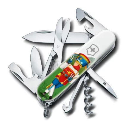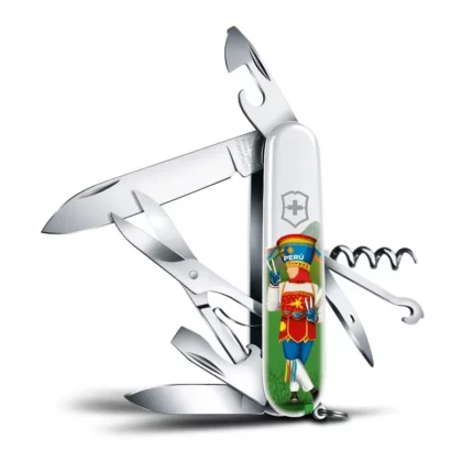 Hoja grande / Hoja pequeña / Sacacorchos / Abrelatas / Destornillador 3 mm / Destapador / Destornillador 6 mm / Pela cables / Punzón, escariador y aguja de coser / Tijeras / Gancho multiuso / Anilla / Pinzas / Palillo de dientes